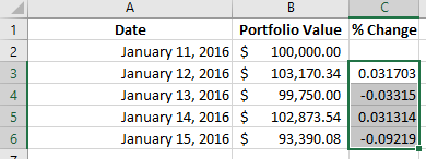 In the next column we will calculate our daily portfolio percentage change. First, in the next column, add the header “% Change”