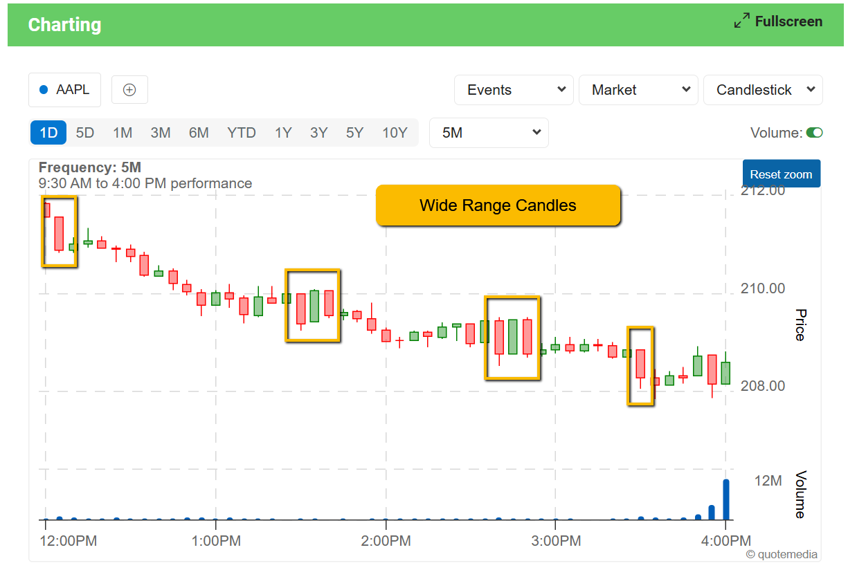 If we know that stocks tend to move in the direction of wide range candles, we can look to the left of any chart to gauge the interest of either the buyers or sellers and trade in the direction of the trend and the candles.